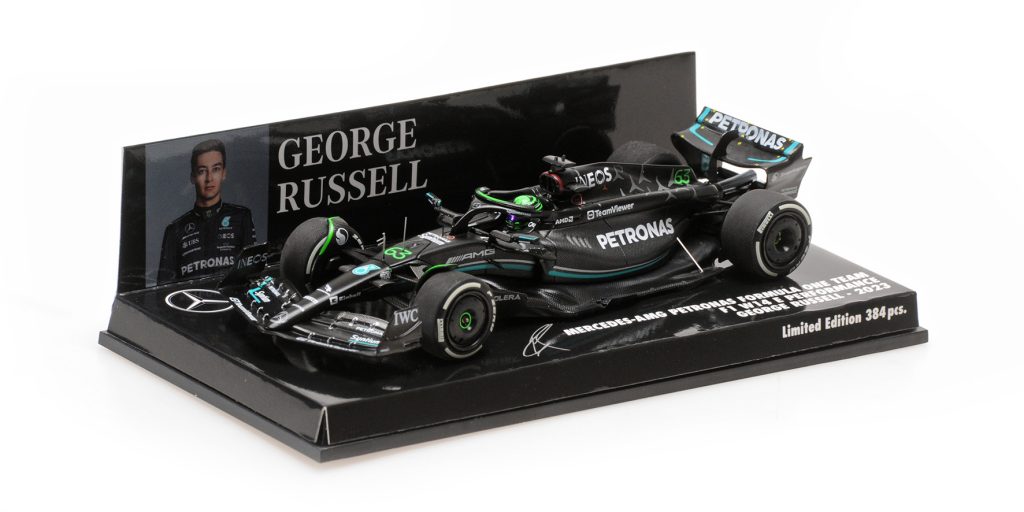 FULLY ASSEMBLED RESIN MODEL MINICHAMPS MERCEDES AMG W14 GEORGE RUSSELL BAHRAIN GP 2023 SCALE 1/43