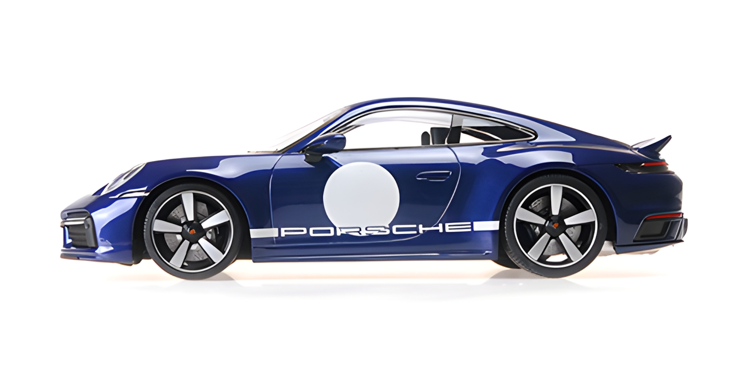 DIE CAST MODEL MINICHAMPS PORSCHE 911 (992) SPORT CLASSIC BLUE METALLIC 2022 WITH STRIPE AND PORSCHE WRITING SCALE 1/18