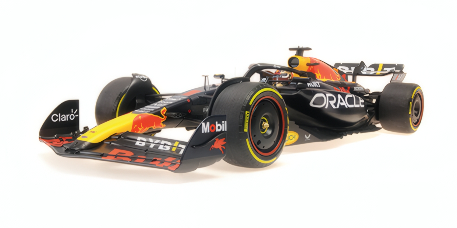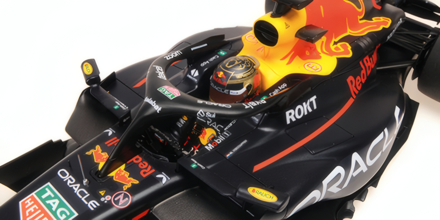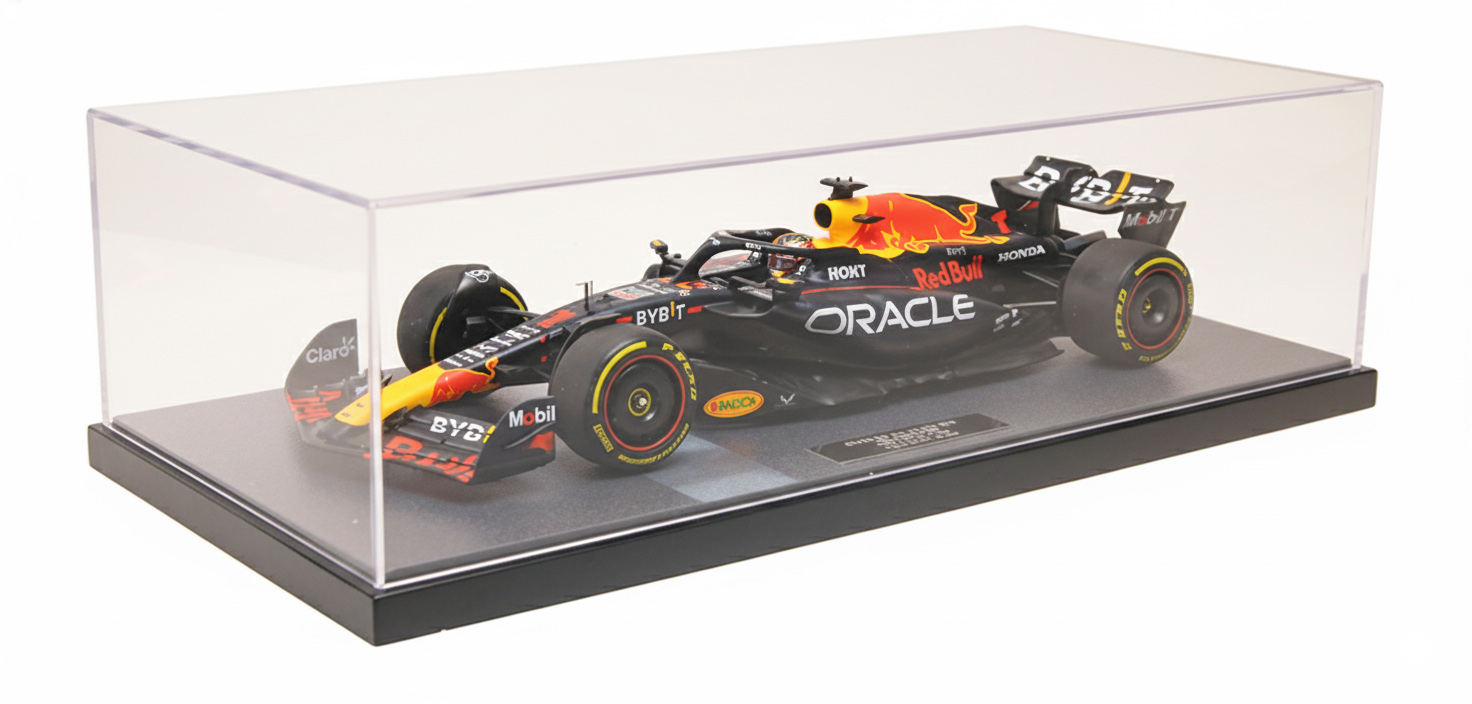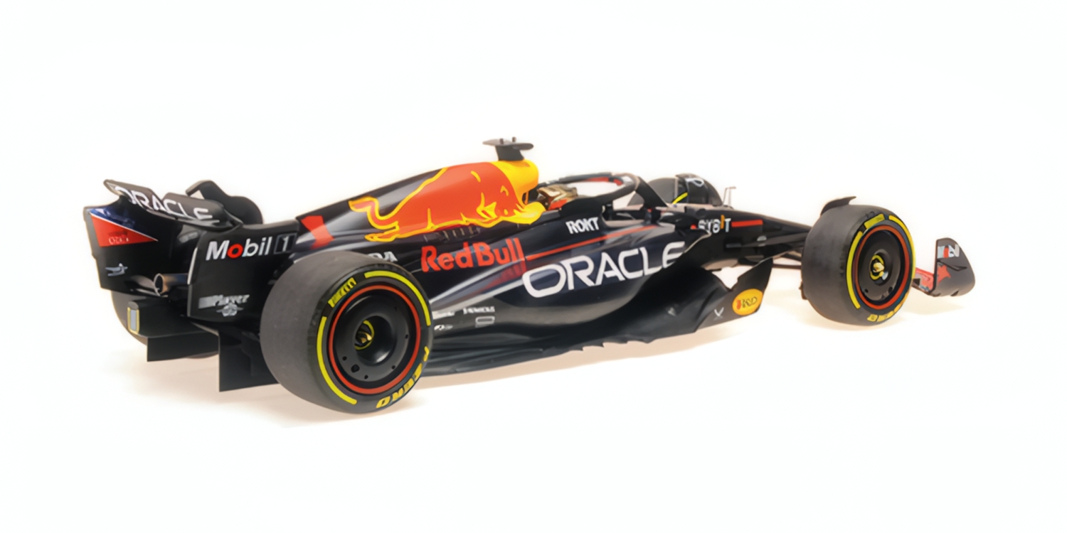 MODELLINO MINICHAMPS MONTATO E VERNICIATO IN RESINA RED BULL RACING HONDA RB19 MAX VERSTAPPEN WINNER QATAR GP WORLD CHAMPION 2023 CON VETRINA SCALA 1/12